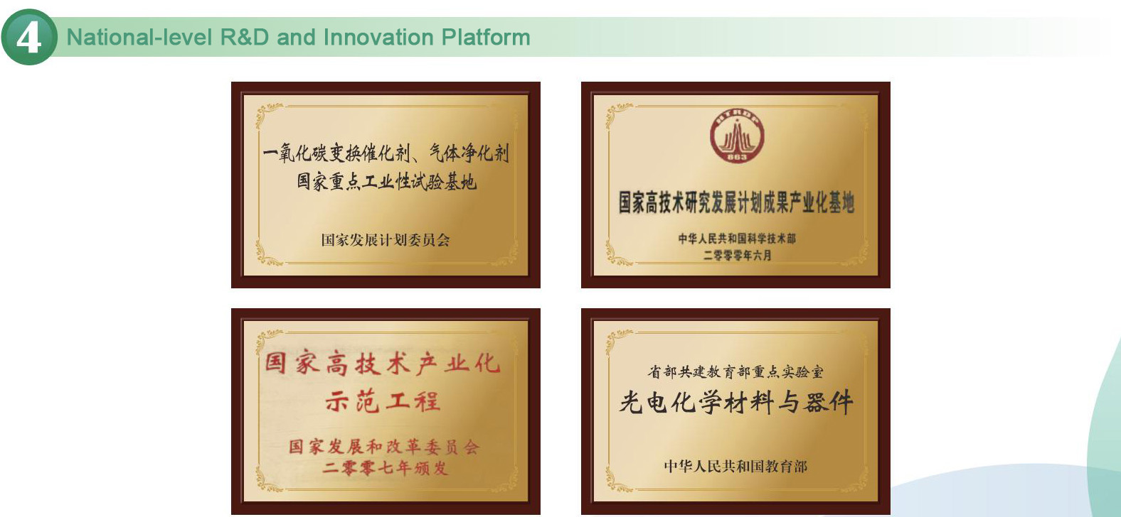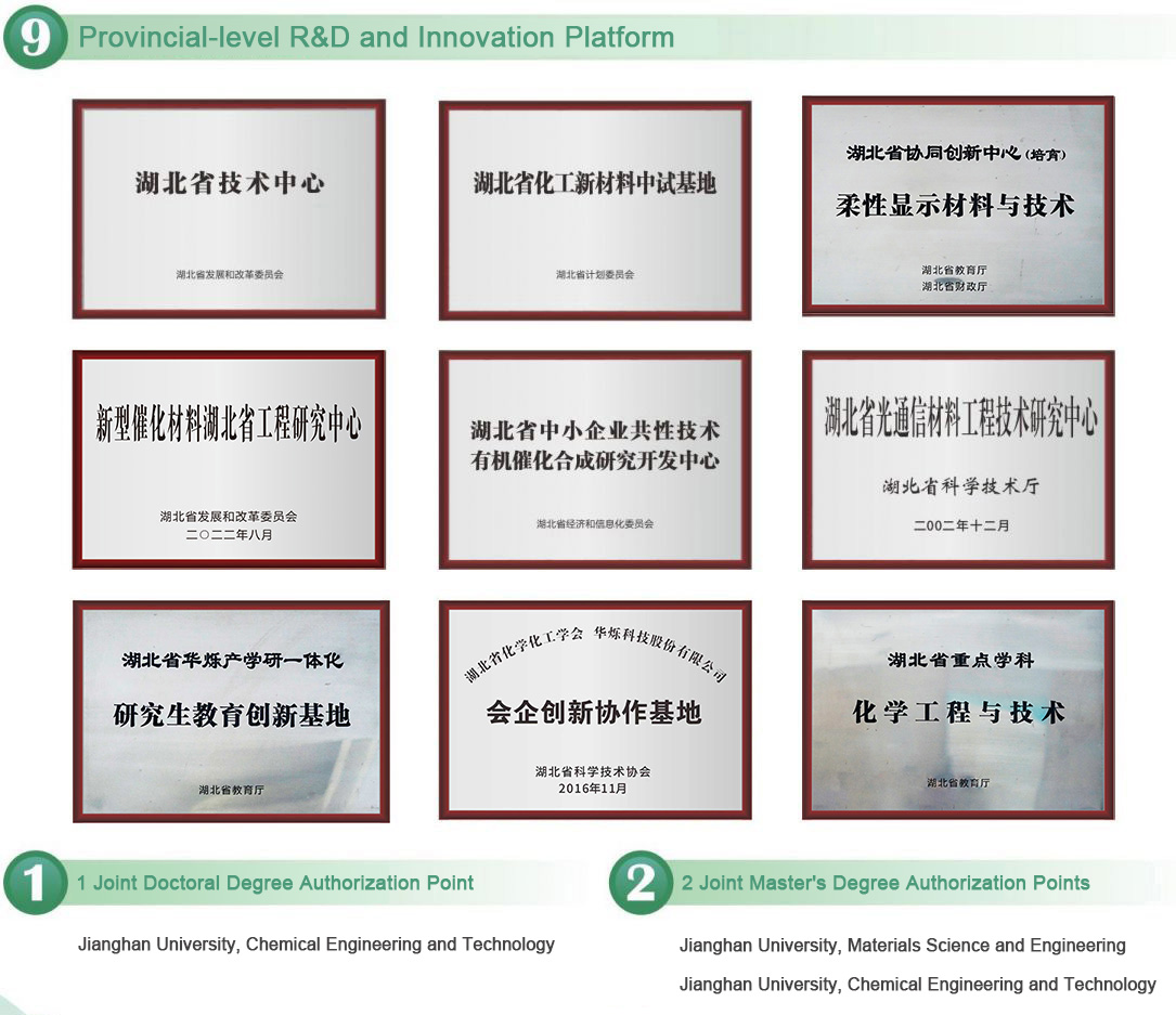 The company is a national high-tech enterprise, one of the first batch of intellectual property advantage enterprises in China, the first batch of intellectual property demonstration enterprises in Hubei Province, the first batch of intellectual property advantage enterprises in Hubei Province, and the strong intellectual property enterprise in Wuhan City. It has four national level R&D innovation platforms, nine provincial level R&D innovation platforms (key laboratories, centers, bases, disciplines), one joint doctoral program, and two joint master's program. It is an important supporting unit for the research and development, pilot and industrial testing, and industrialization demonstration of chemical new materials and chemical new processes in China and Hubei Province. “ Huashuo; It has become a well-known brand in the national chemical industry and was awarded the title of China Famous Trademark in 2014.